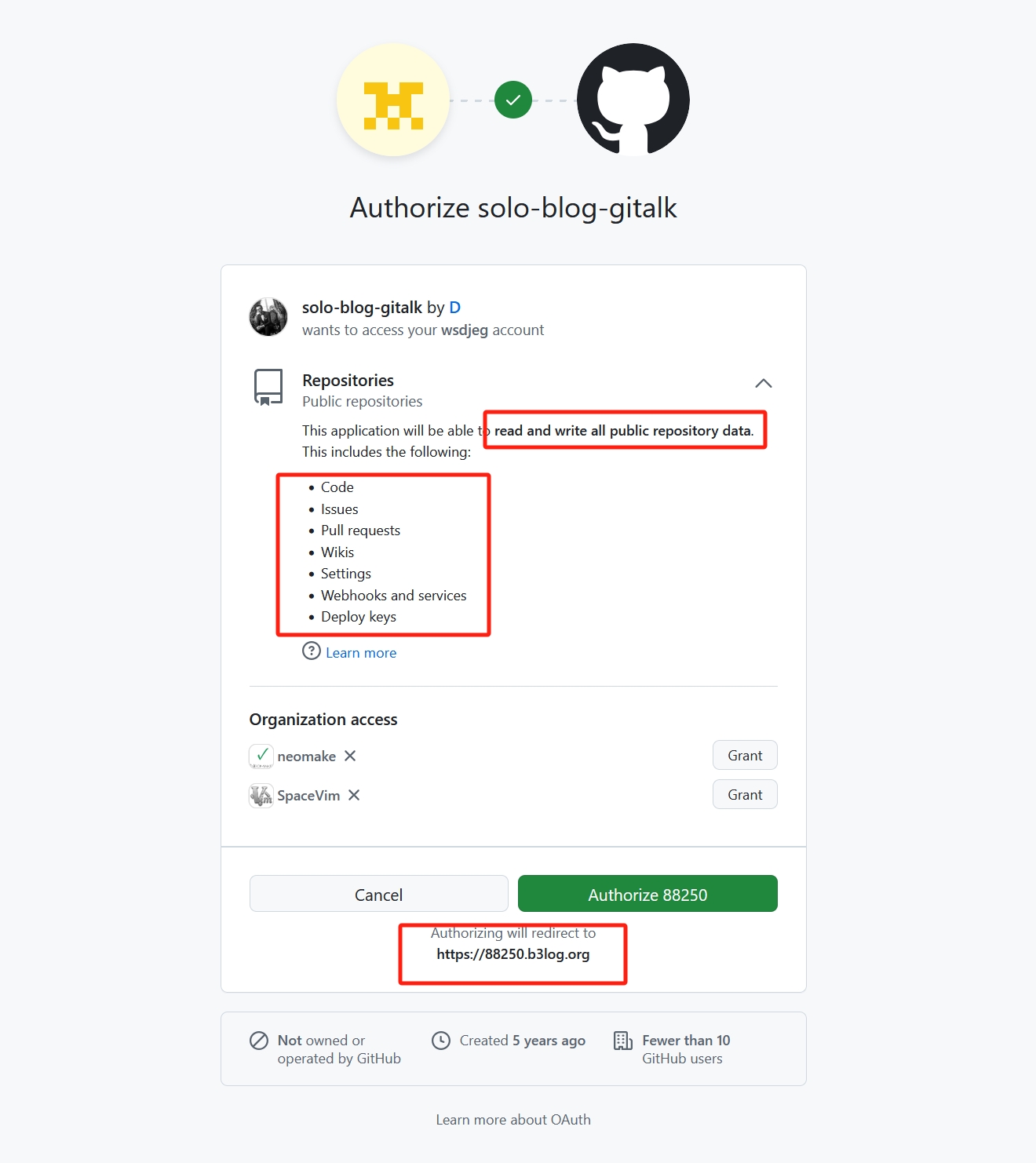最后,我们再看下链滴作者 D 的博客 https://88250.b3log.org 评论系统,使用 Github 登录时所需要的权限: