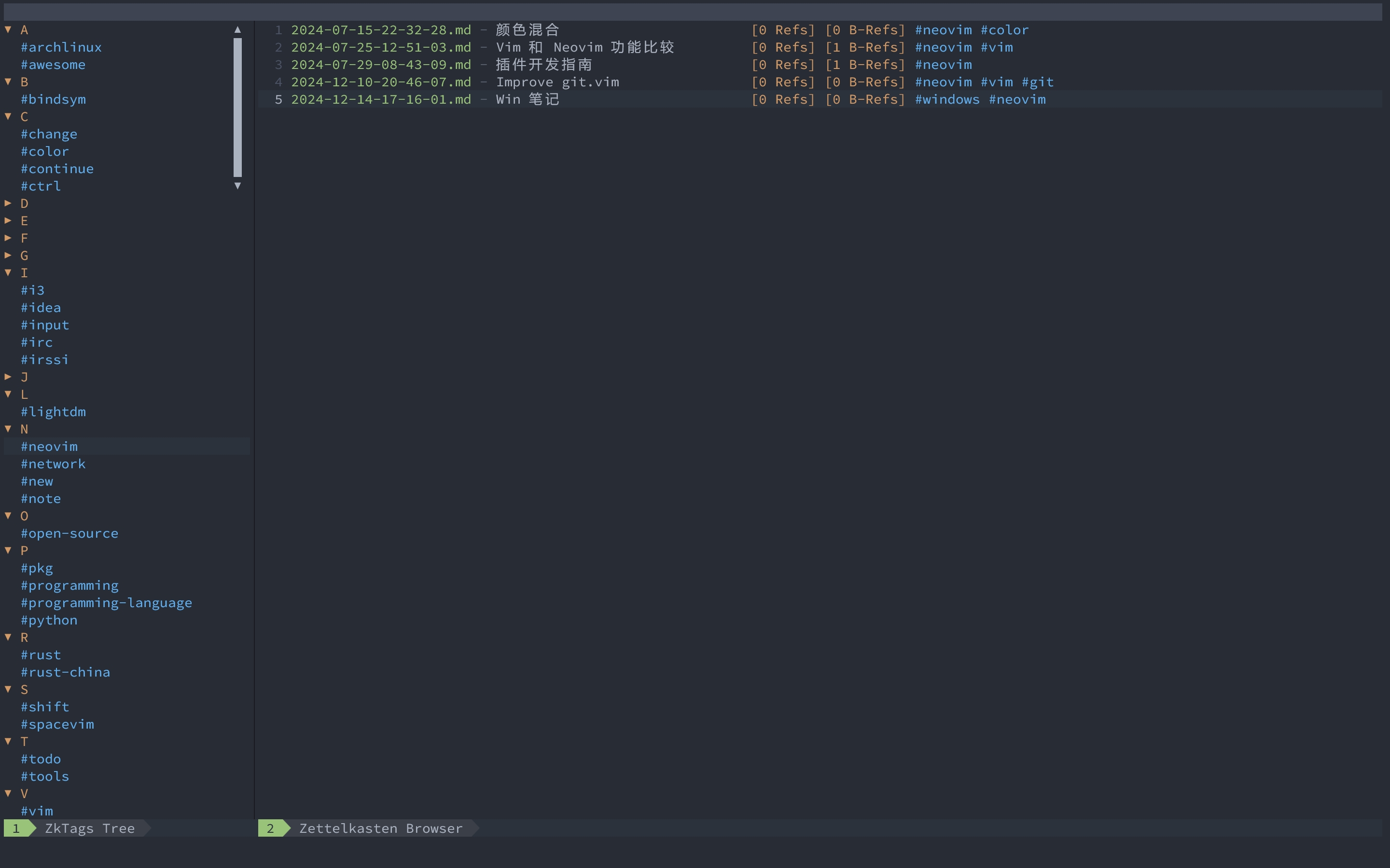 最开始,我是想找一个三端(手机、电脑、网页)同步的笔记软件,但是似乎没有合适的。因为都是文本编辑,而且如果要使用卡片盒笔记法的话, 那么笔记就需要遵循一定的格式。日常使用 Neovim 也非常多,几乎文本的编辑都是在 Neovim 内完成的,索性就不再舍近求远去找笔记软件了, 就直接在 Neovim 内完成。检索了下 Github 发现还是有不少现成的插件实现,但是功能似乎都不是很完善。